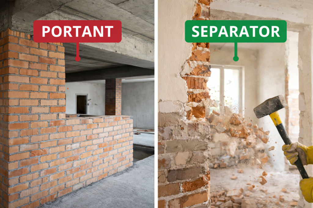 - Demolarea pereților interiori (dacă este cazul) – cărămidă sau gips-carton.